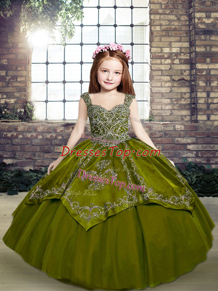 Sleeveless Floor Length Beading and Embroidery Lace Up Girls Pageant Dresses with Olive Green