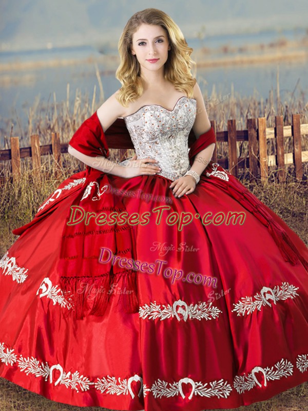 Sleeveless Floor Length Beading and Embroidery Lace Up Quinceanera Gown with Red