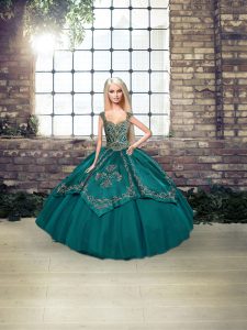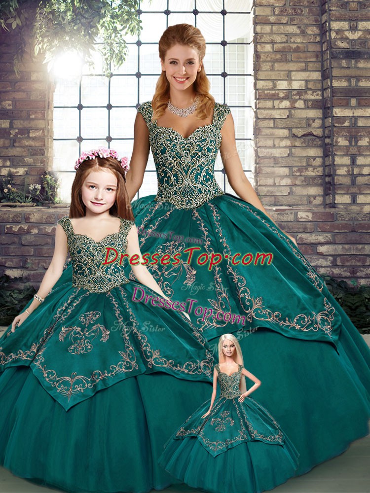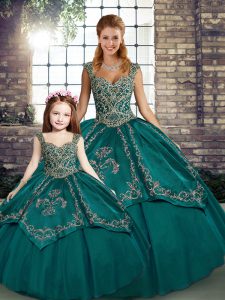Sleeveless Floor Length Beading and Embroidery Lace Up Quinceanera Gown with Teal