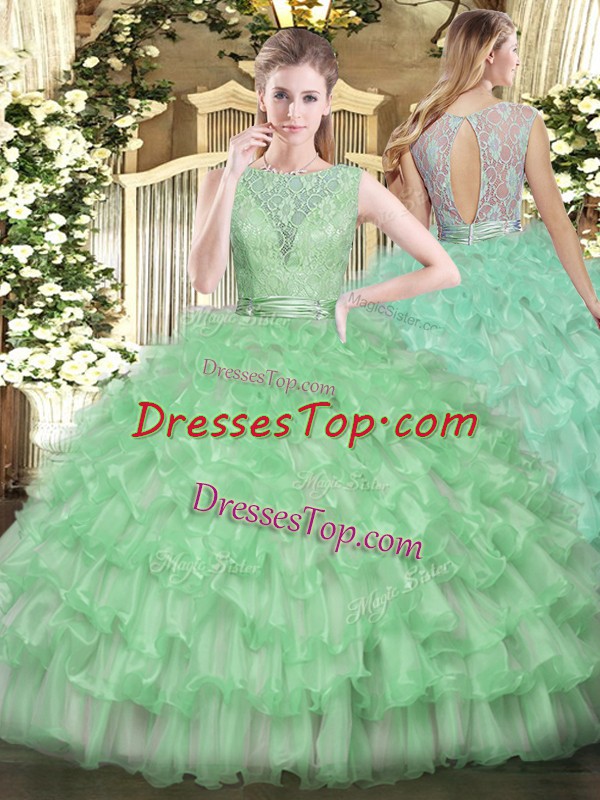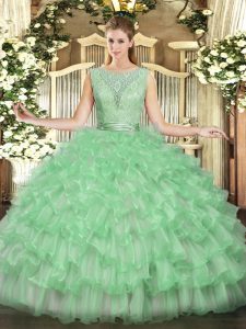 Sleeveless Floor Length Beading and Ruffled Layers Backless Sweet 16 Quinceanera Dress with Apple Green