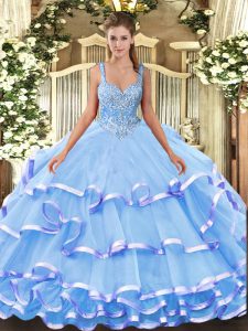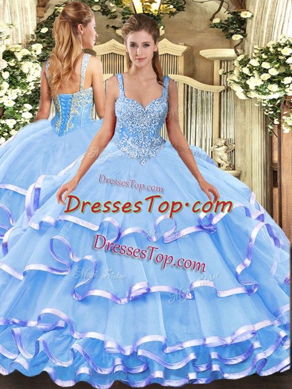 Sleeveless Floor Length Beading and Ruffled Layers Lace Up Quinceanera Dresses with Blue