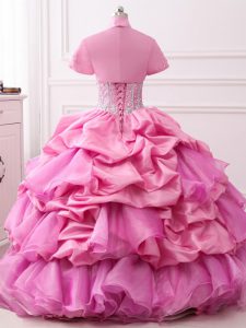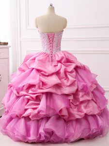 Sleeveless Floor Length Beading and Ruffles and Pick Ups Lace Up Sweet 16 Dress with Rose Pink