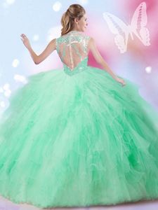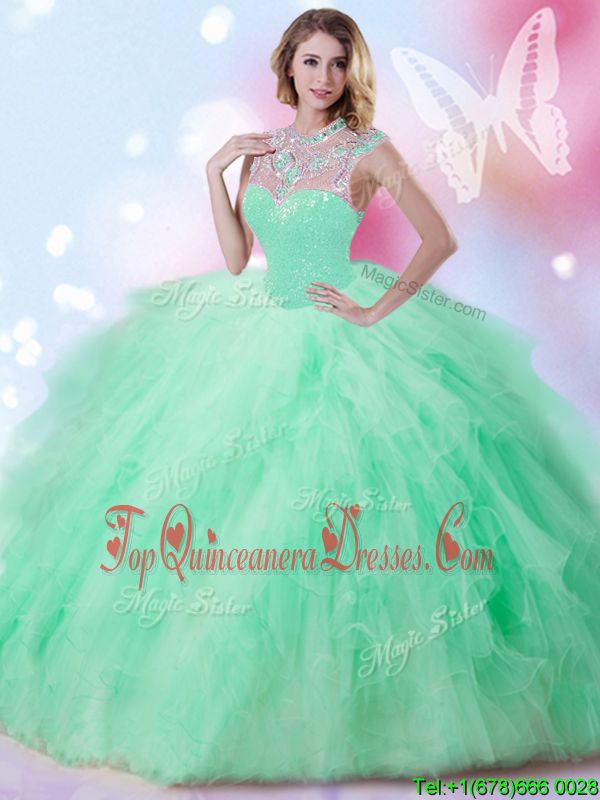 Sleeveless Floor Length Beading and Ruffles and Sequins Zipper 15th Birthday Dress with Apple Green