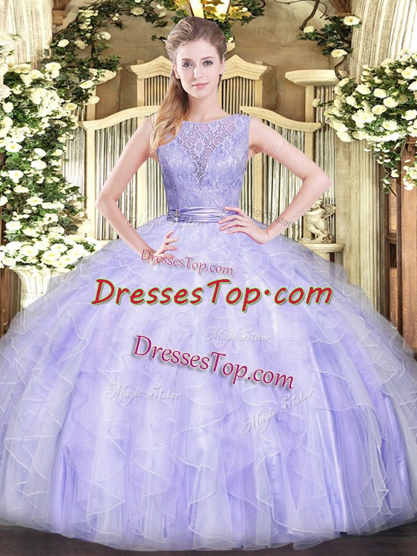 Sleeveless Floor Length Beading and Ruffles Backless Ball Gown Prom Dress with Lavender