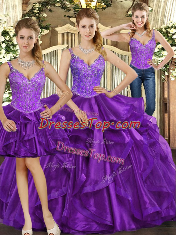 Sleeveless Floor Length Beading and Ruffles Lace Up 15 Quinceanera Dress with Purple