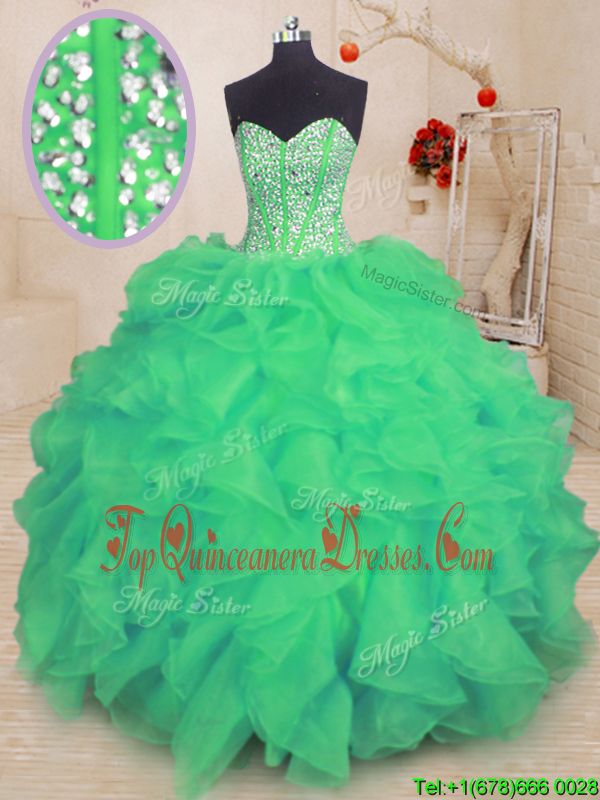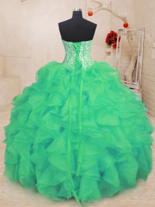 Sleeveless Floor Length Beading and Ruffles Lace Up 15 Quinceanera Dress with Turquoise