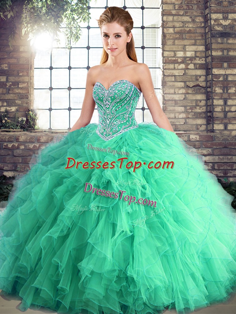 Sleeveless Floor Length Beading and Ruffles Lace Up 15 Quinceanera Dress with Turquoise