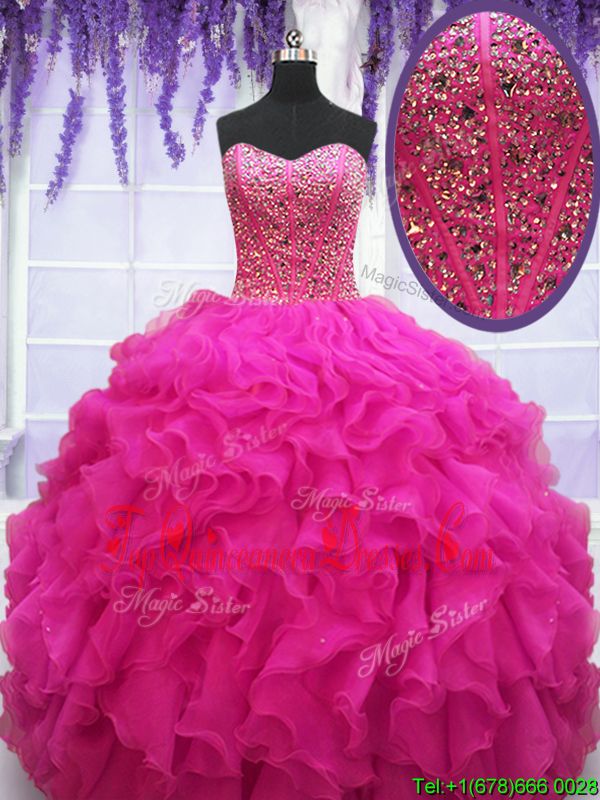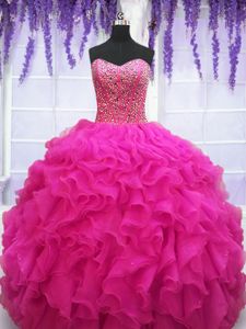 Sleeveless Floor Length Beading and Ruffles Lace Up Ball Gown Prom Dress with Purple