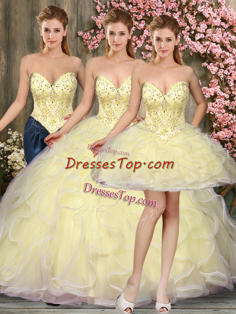 Sleeveless Floor Length Beading and Ruffles Lace Up Quinceanera Dress with Light Yellow