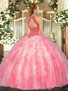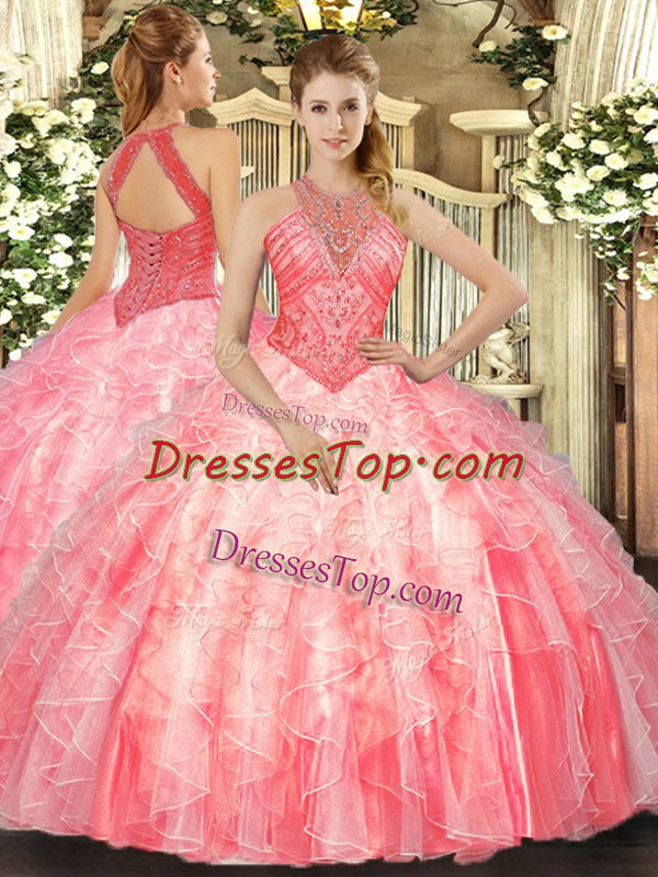 Sleeveless Floor Length Beading and Ruffles Lace Up Sweet 16 Dress with Watermelon Red