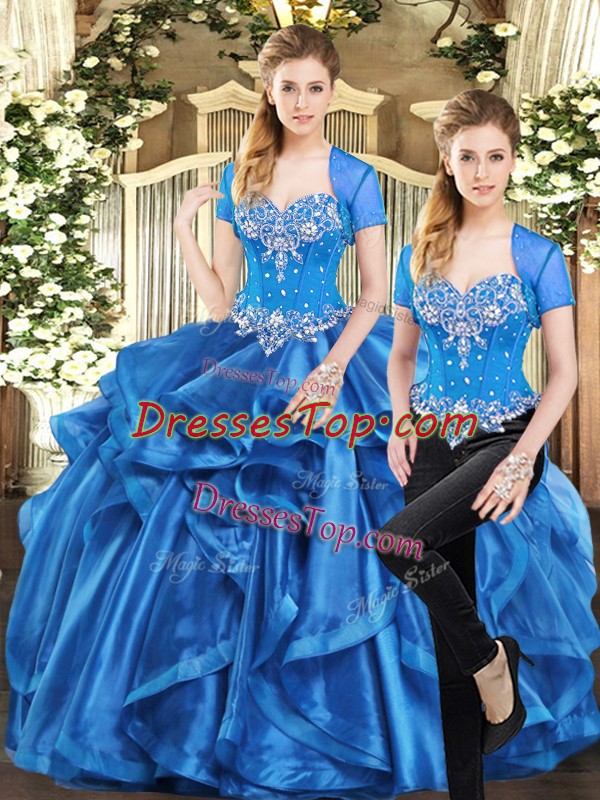 Sleeveless Floor Length Beading and Ruffles Lace Up Sweet 16 Quinceanera Dress with Blue