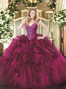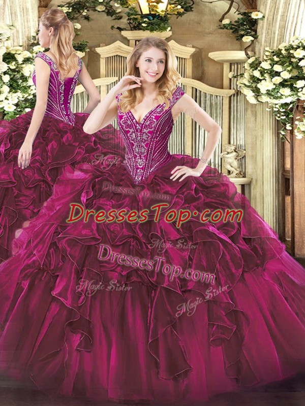 Sleeveless Floor Length Beading and Ruffles Lace Up Sweet 16 Quinceanera Dress with Fuchsia