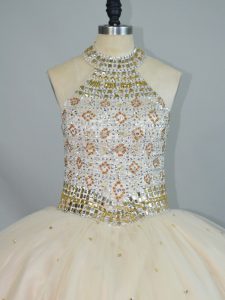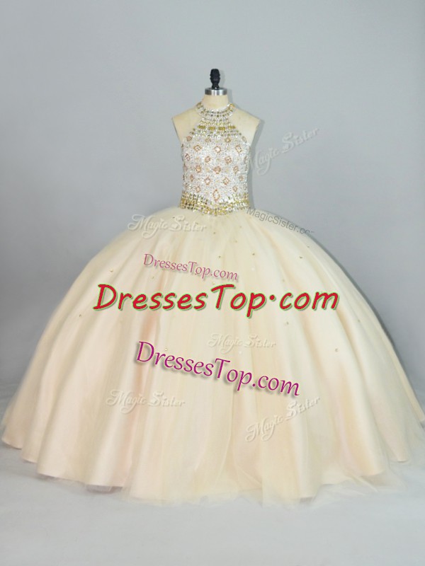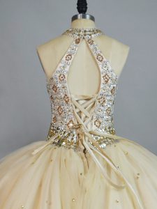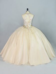 Sleeveless Floor Length Beading Lace Up 15th Birthday Dress with Champagne