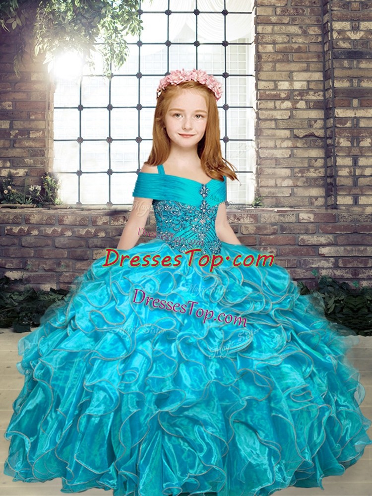 Sleeveless Floor Length Beading Lace Up Little Girls Pageant Gowns with Aqua Blue