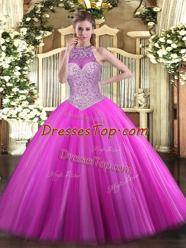 Sleeveless Floor Length Beading Lace Up Quinceanera Dress with Fuchsia