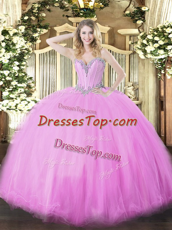 Sleeveless Floor Length Beading Lace Up Quinceanera Gown with Lilac