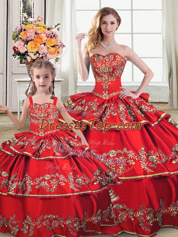 Sleeveless Floor Length Embroidery and Ruffled Layers Lace Up 15 Quinceanera Dress with Red