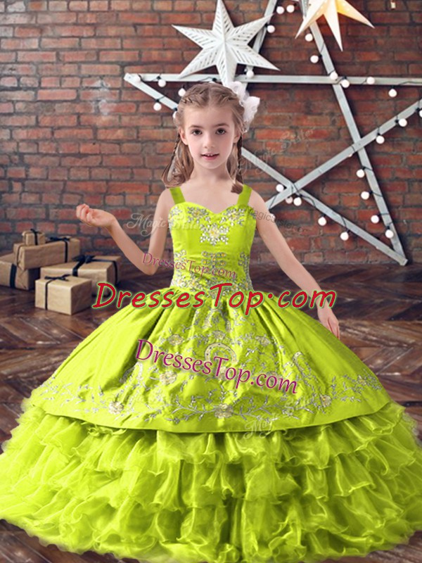 Sleeveless Floor Length Embroidery and Ruffled Layers Lace Up Pageant Dress for Womens with Yellow Green