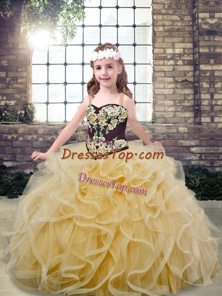 Sleeveless Floor Length Embroidery and Ruffles Lace Up Child Pageant Dress with Champagne