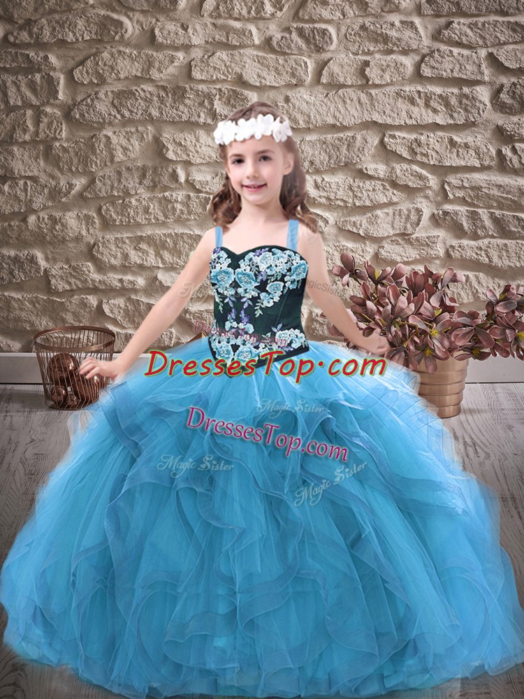 Sleeveless Floor Length Embroidery and Ruffles Lace Up Little Girls Pageant Gowns with Baby Blue