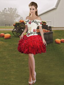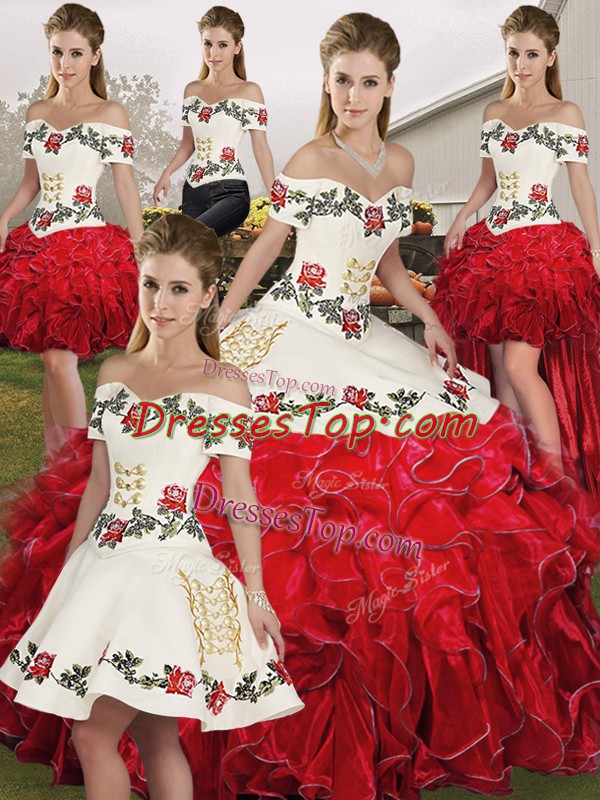 Sleeveless Floor Length Embroidery and Ruffles Lace Up Quince Ball Gowns with White And Red