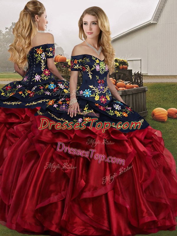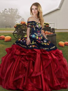 Sleeveless Floor Length Embroidery and Ruffles Lace Up Quinceanera Gown with Red And Black