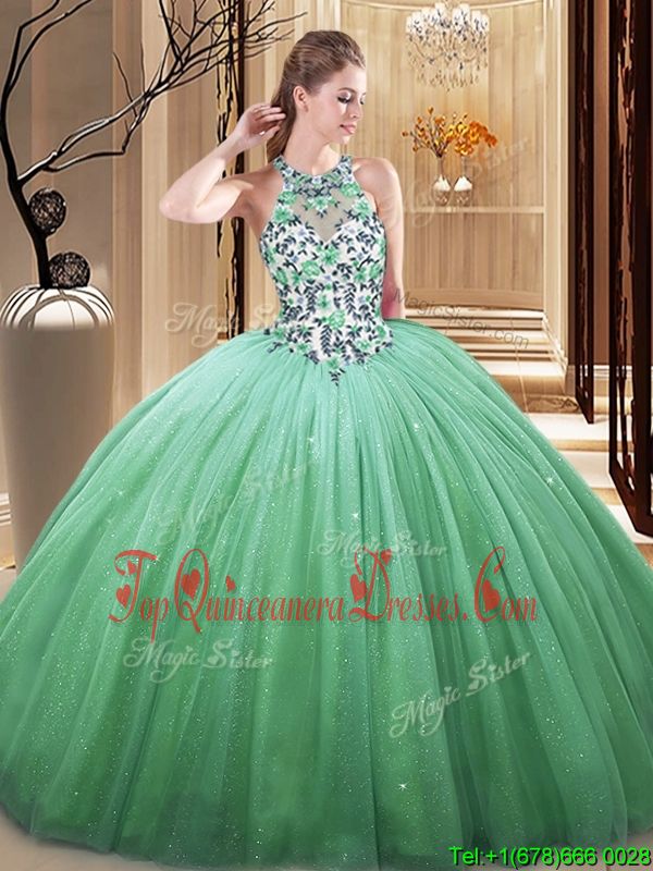 Sleeveless Floor Length Lace and Appliques Lace Up Quince Ball Gowns with Green