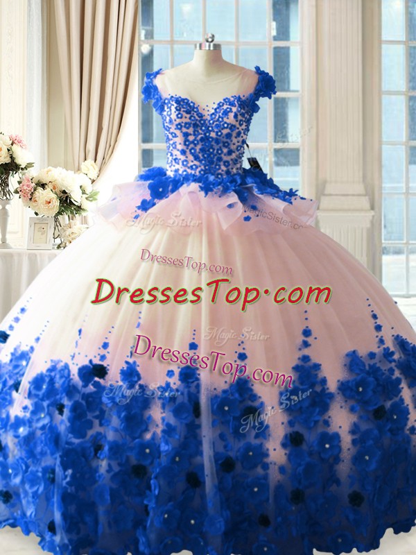 Sleeveless Hand Made Flower Zipper Quince Ball Gowns with Blue And White Brush Train