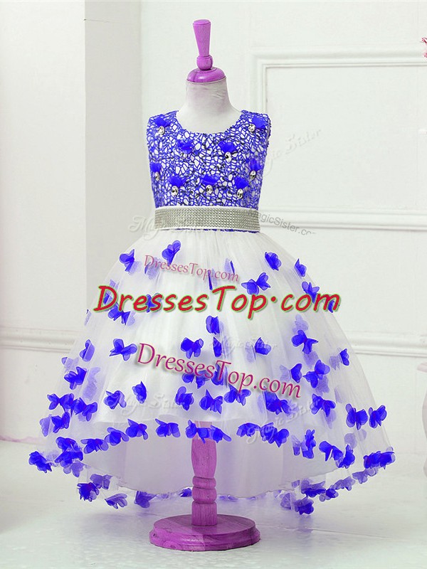 Sleeveless High Low Appliques and Sequins Zipper Pageant Dress Toddler with Blue And White