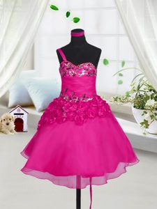 Sleeveless Knee Length Beading and Hand Made Flower Lace Up Kids Pageant Dress with Fuchsia