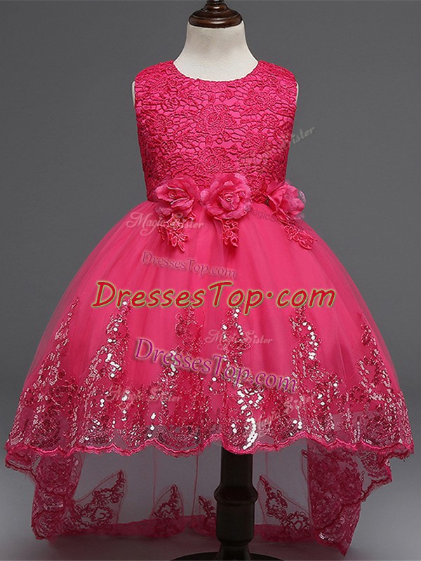 Sleeveless Lace and Appliques and Bowknot and Hand Made Flower Zipper Little Girl Pageant Dress