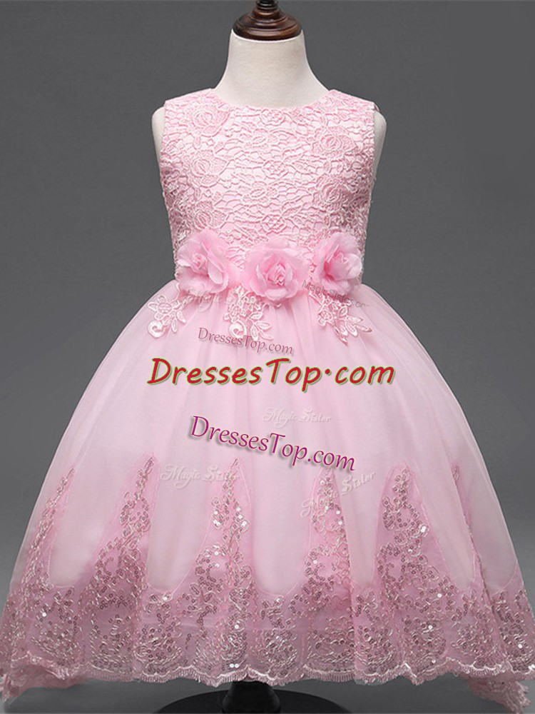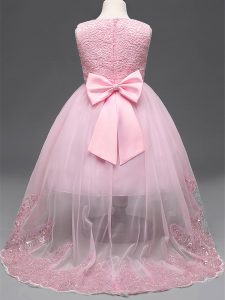 Sleeveless Lace and Appliques and Bowknot and Hand Made Flower Zipper Little Girls Pageant Dress