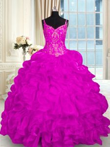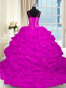 Sleeveless Organza Brush Train Lace Up Quince Ball Gowns in Fuchsia for with Beading and Embroidery and Ruffles