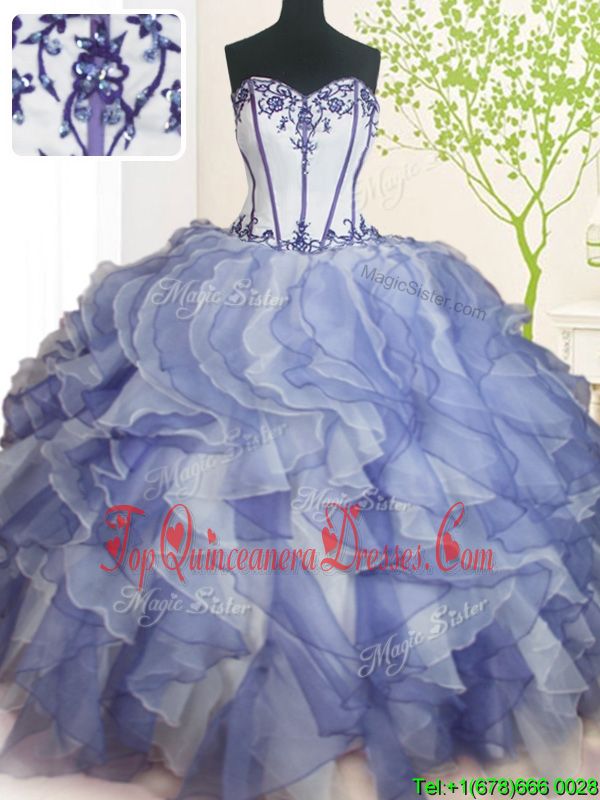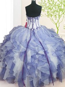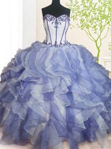 Sleeveless Organza Floor Length Lace Up Court Dresses for Sweet 16 in Blue And White for with Beading and Ruffles