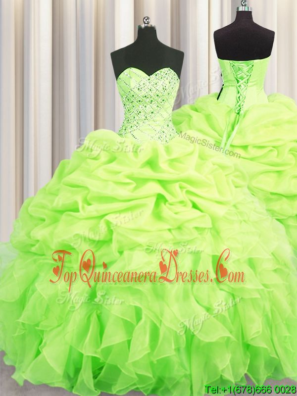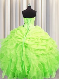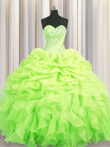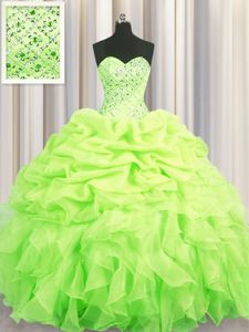 Sleeveless Organza Floor Length Lace Up Court Dresses for Sweet 16 in Yellow Green for with Beading and Ruffles and Pick Ups