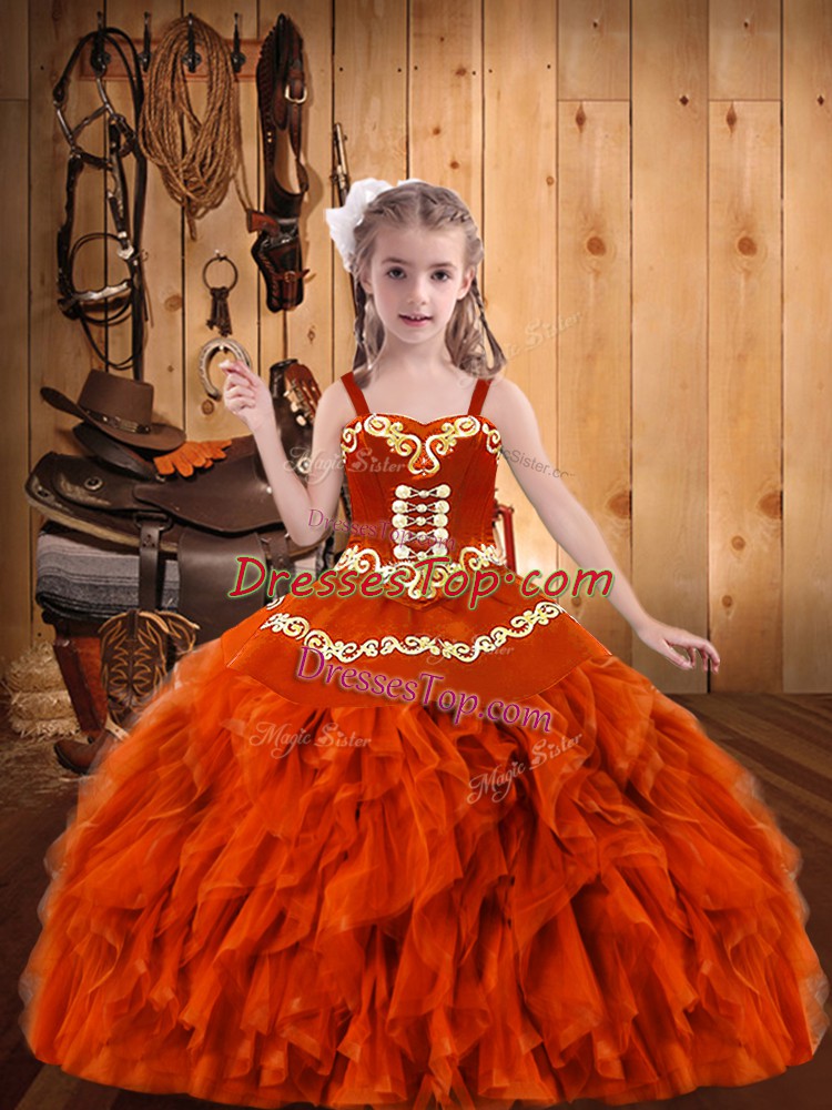 Sleeveless Organza Floor Length Lace Up Kids Formal Wear in Orange Red with Embroidery and Ruffles