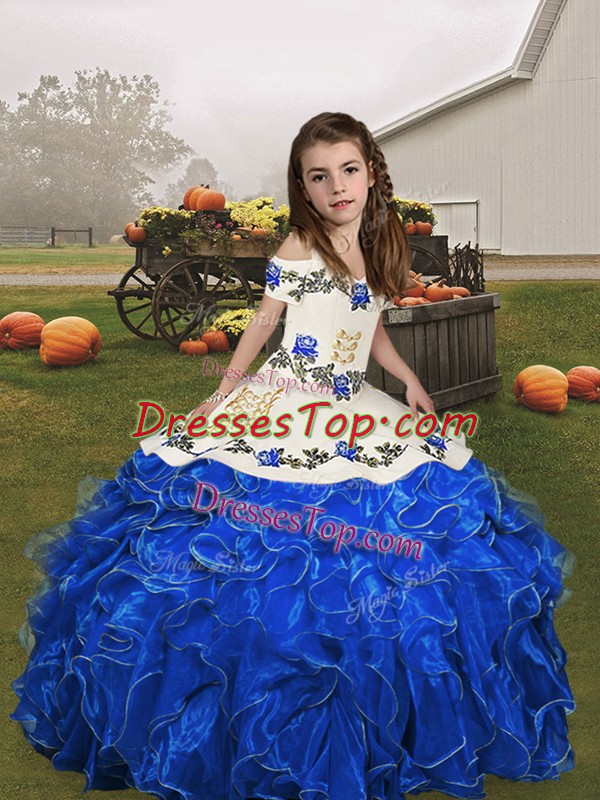 Sleeveless Organza Floor Length Lace Up Kids Formal Wear in Royal Blue with Embroidery and Ruffles