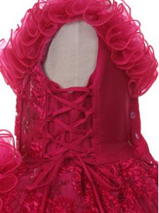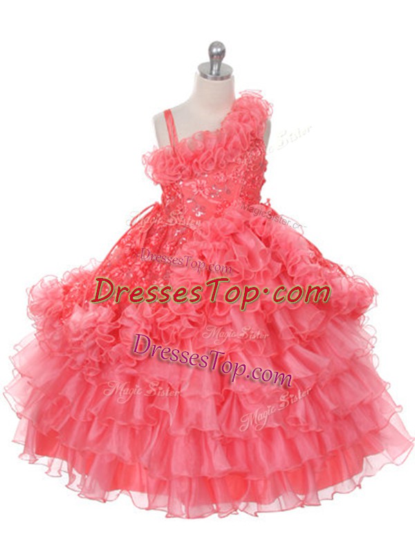 Sleeveless Organza Floor Length Lace Up Little Girls Pageant Dress in Watermelon Red with Lace and Ruffles and Ruffled Layers