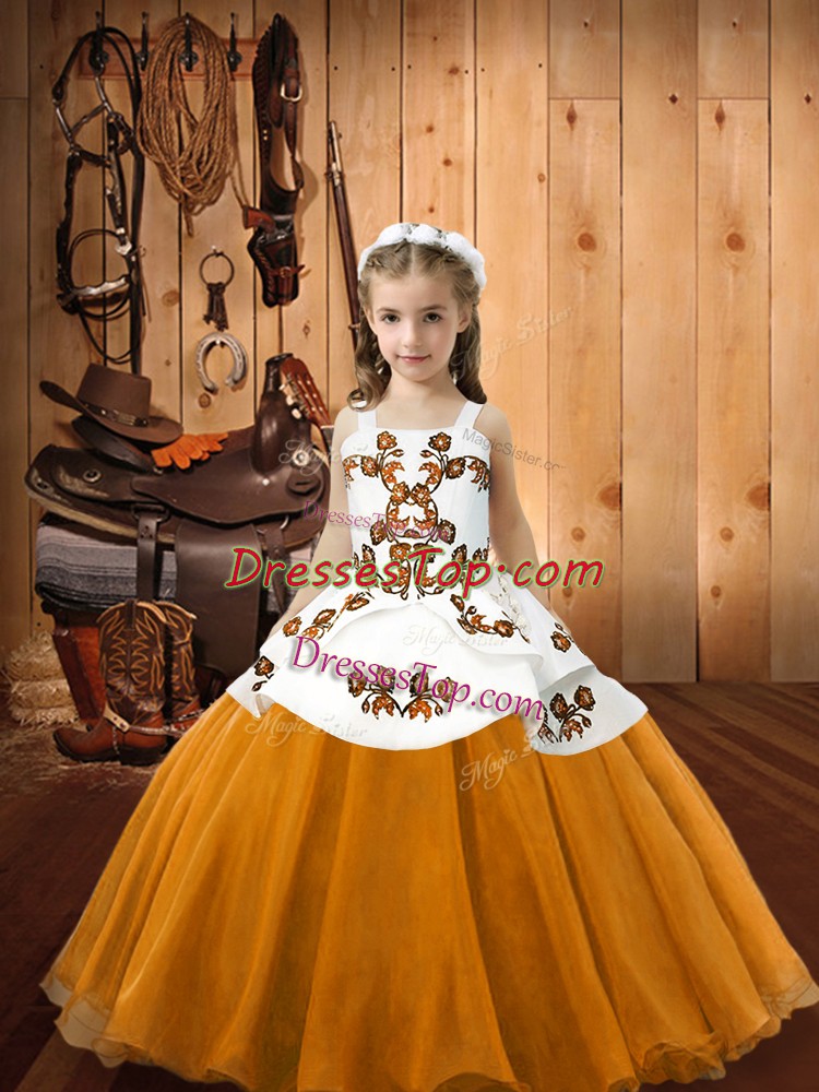 Sleeveless Organza Floor Length Lace Up Little Girls Pageant Gowns in Orange with Embroidery