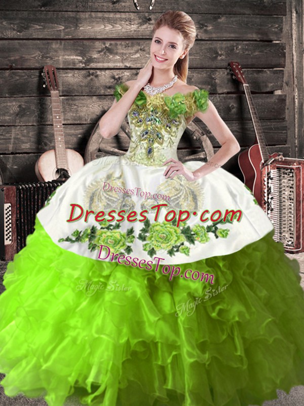 Sleeveless Organza Floor Length Lace Up Quince Ball Gowns in Green with Embroidery and Ruffles