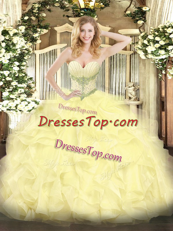 Sleeveless Organza Floor Length Lace Up Quince Ball Gowns in Yellow with Beading and Ruffles