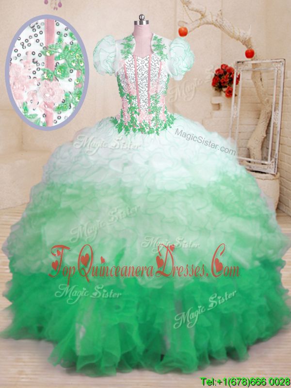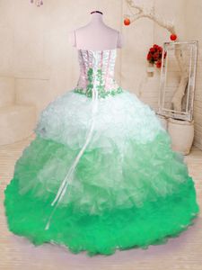 Sleeveless Organza Floor Length Lace Up Quinceanera Gown in Turquoise for with Beading and Ruffles and Hand Made Flower