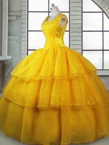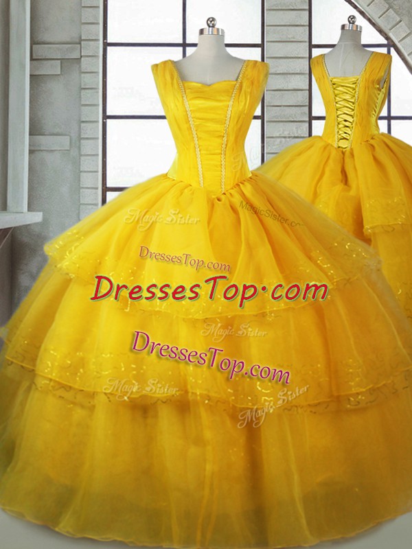 Sleeveless Organza Floor Length Lace Up Sweet 16 Dresses in Gold with Ruffled Layers