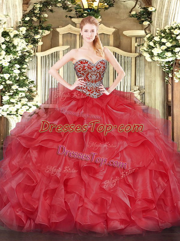 Sleeveless Organza Floor Length Lace Up Sweet 16 Quinceanera Dress in Coral Red with Beading