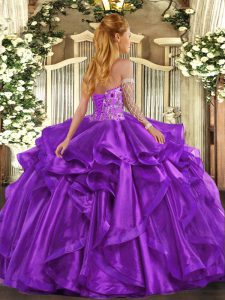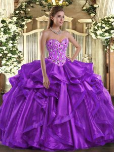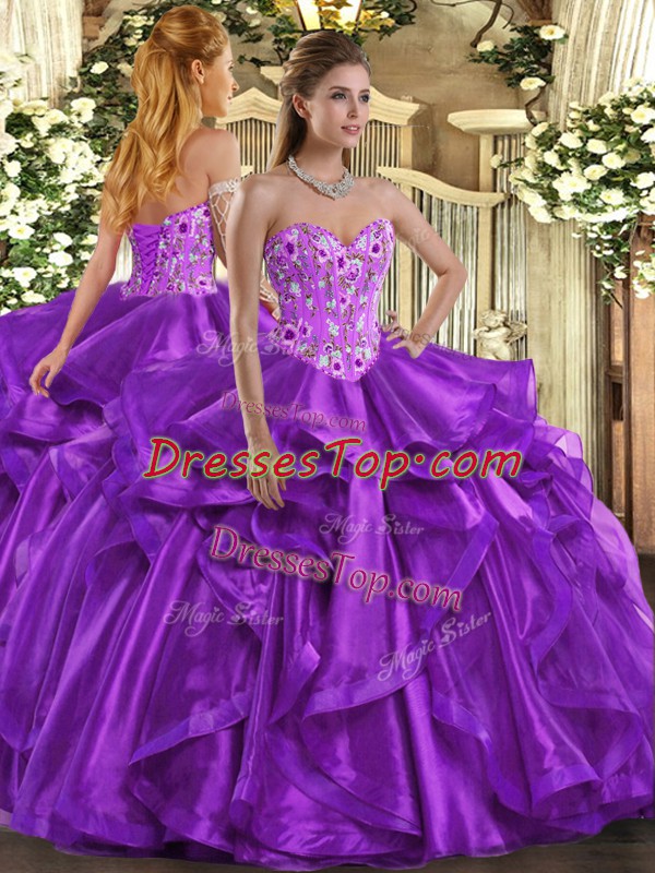 Sleeveless Organza Floor Length Lace Up Sweet 16 Quinceanera Dress in Eggplant Purple with Embroidery and Ruffles