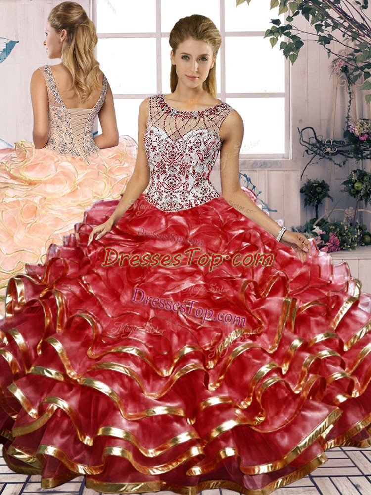 Sleeveless Organza Floor Length Lace Up Vestidos de Quinceanera in Red with Beading and Ruffles