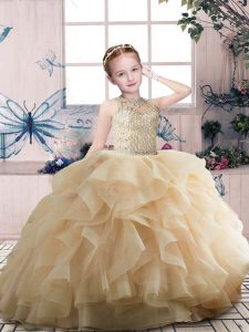 Sleeveless Organza Floor Length Zipper Girls Pageant Dresses in Champagne with Beading and Ruffles
