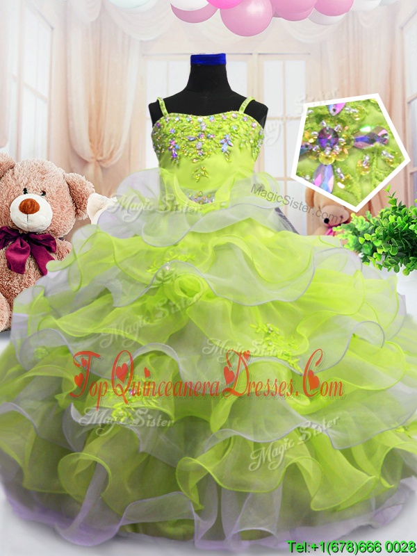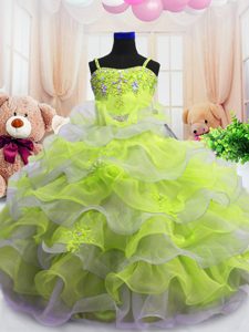 Sleeveless Organza Floor Length Zipper Pageant Dress for Teens in Peach for with Beading and Ruffles and Pick Ups