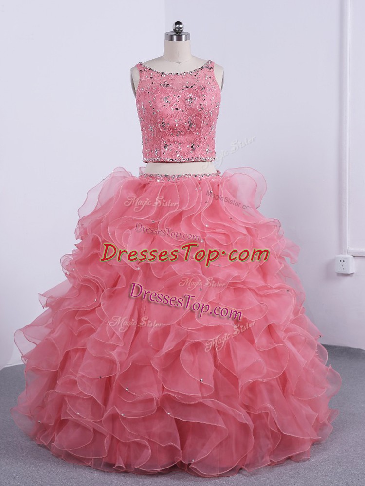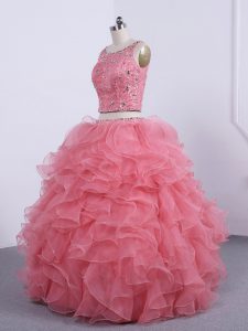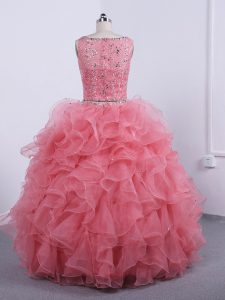 Sleeveless Organza Floor Length Zipper Sweet 16 Dress in Watermelon Red with Beading and Ruffles
