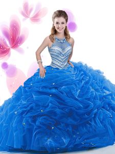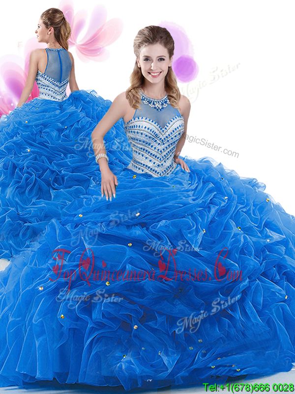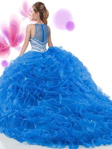 Sleeveless Ruffles Zipper Quince Ball Gowns with Royal Blue Court Train